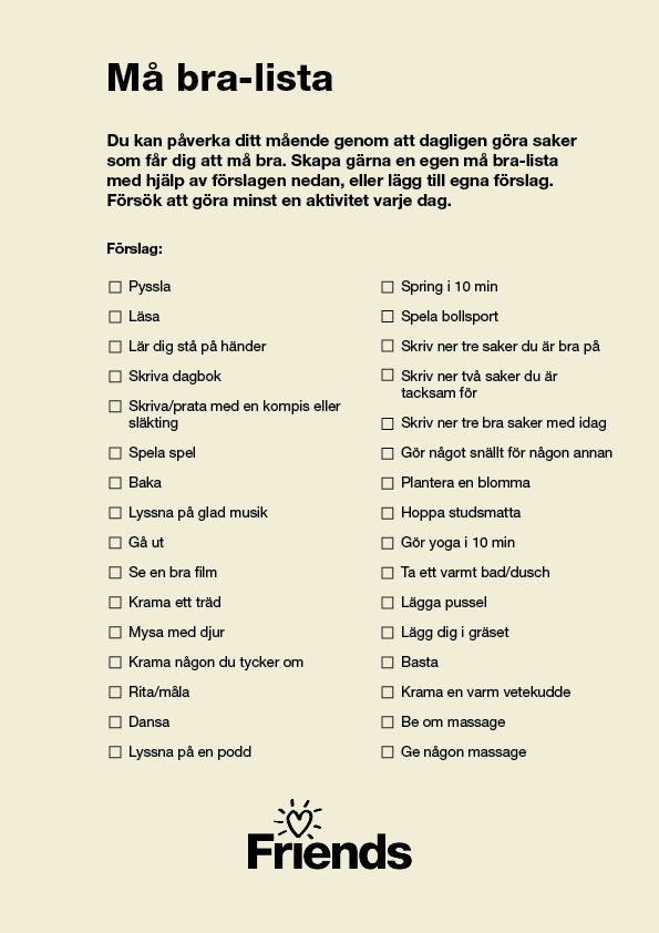 Du kan påverka ditt mående genom att dagligen göra saker som får dig att må bra. Skapa gärna en egen må bra-lista med